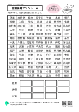 言葉発見プリント 【言葉発見プリント4】たくさんの言葉の中から妖怪の言葉を探し出して