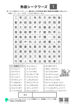 【熟語シークワーズ1】熟語を探して丸をつけて残った文字で言葉を作ろう!