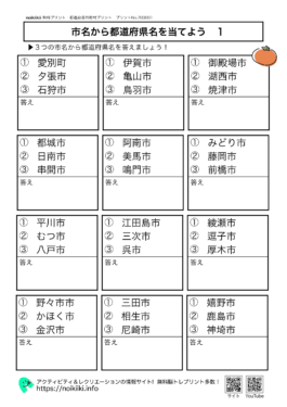 【都道府県クイズプリント】3つの市名から都道府県を当てよう!無料脳トレプリント